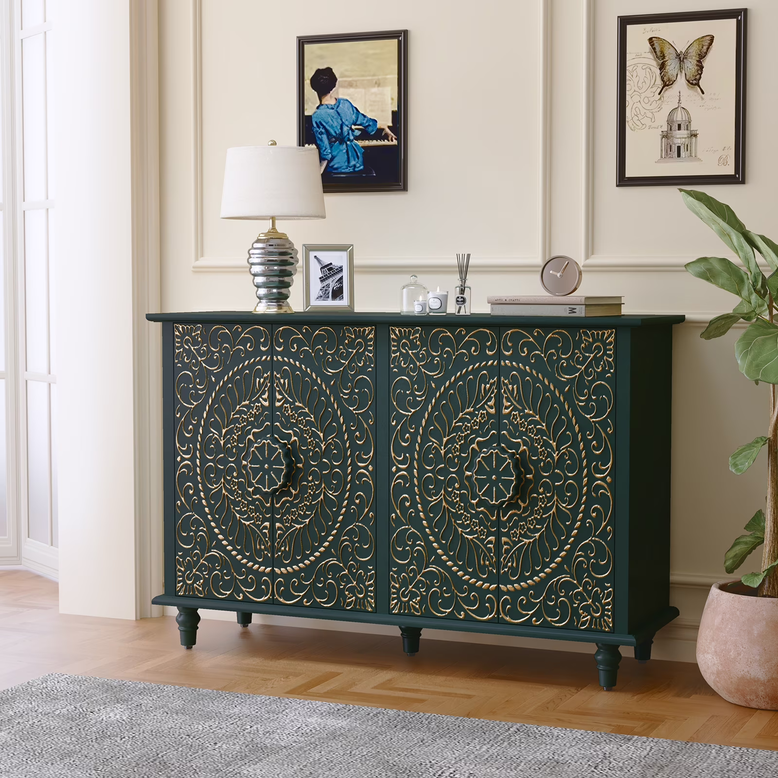 HLR 48"W Vintage Wood 4 Doors Sideboard Buffet Cabinet with Storage for Living Room, Credenza Green.