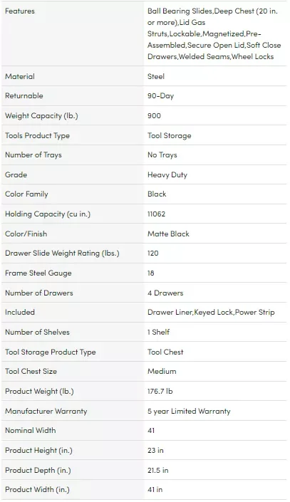 Introducing the all new Husky Industrial 41 in. W x 21.5 in. D 4-Drawer Tool Chest. Part of Husky's Professional Duty lineup, this chest has a heavy-duty 18-Gauge steel frame and is built to last. Each drawer is equipped with 120 lbs. rated ball-bearing slides that feature a soft-closing mechanism. Never worry about your drawers slamming and shut and tools moving around again. All drawers also have thick, pre-cut liners embossed with Husky logos to protect your tools. Inside the top hutch is an integrated power strip with USB ports and a magnetic back wall to place items for quick access. There is also a magnetic LED light strip that can be used to illuminate the interior of the hutch. Finally, combine this chest with the coordinating rolling cabinet (Model H41TR11HD, sold separately) for even more tool storage.