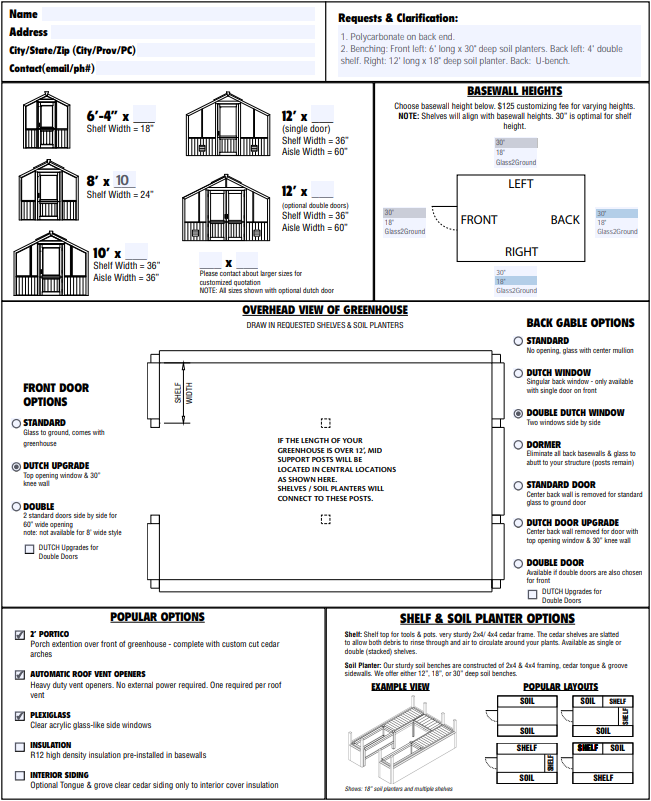 An 8x12 with combination 18” and 30” basewalls. 18” on the right side with 18” planters on the floor allows for more sun for taller plants such as tomatoes. Clear plexiglass sidewalls allows for a nice, clean look, and there is a single shelf in the back left of the kit. The dutch door complements the beautiful look of the 30” basewalls on the front.